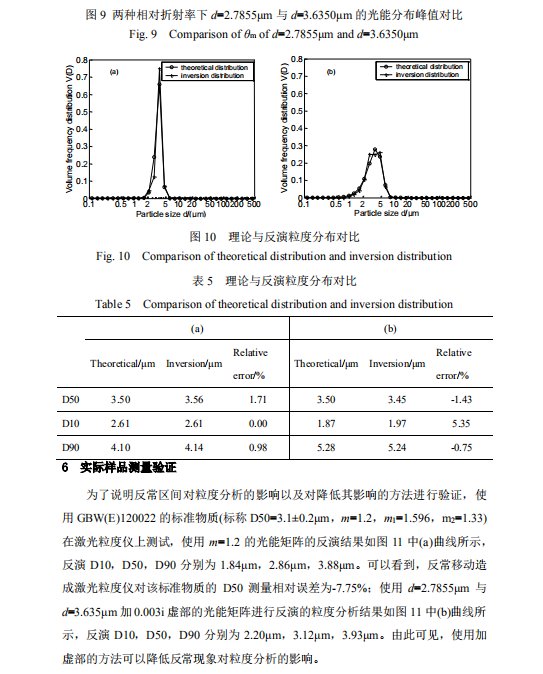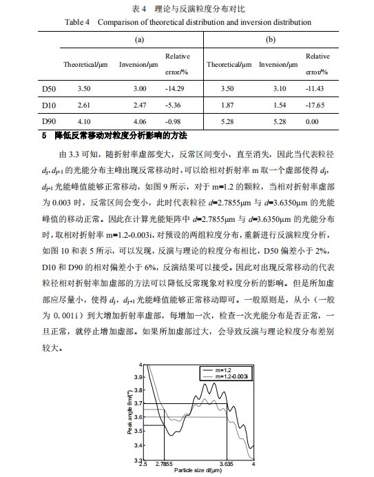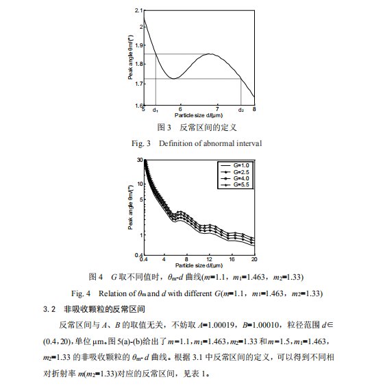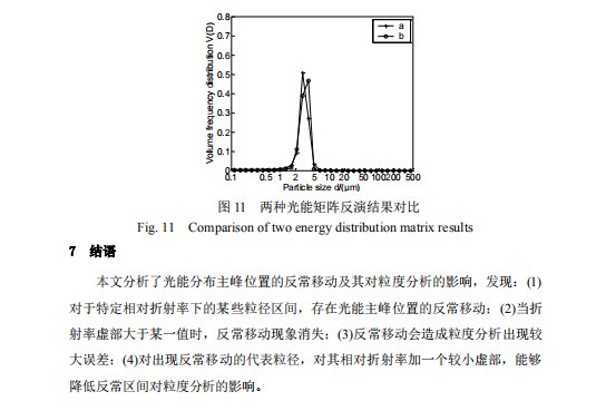 摘要 基于Mie散射原理的激光粒度仪是颗粒测量领域应用最广泛的仪器之一。通常情况下颗粒越小,散射角越大,激光粒度仪探测器阵列接收到的散射光能分布的主峰位置越靠外。但是,对特定相对折射率的颗粒,在某些粒径区间,散射光能分布的主峰位置会随着颗粒粒径的减小而向探测器阵列的内侧移动,称之为散射光能分布的反常移动。根据 Mie 散射原理,给出了反常移动的规律以及不同相对折射率下反常移动的粒径区间,分析了反常移动对粒度分析的影响,提出了降低该影响的方法,并对实际样品进行测试对比。结果表明,该方法可以降低反常移动对粒度分析的影响。